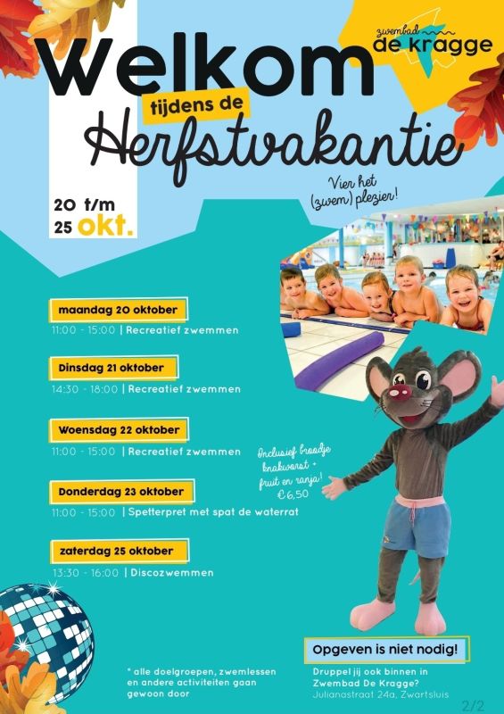 Bekijk onze mooie flyer maar eens, ontmoet "SPAT" onze waterrat, kom lekker dansen tijdens de disco of kom gewoon gezellig met familie, vriendjes/vriendinnetjes van onze waterglijbaan roetsjen. Zijn jullie erbij tijdens de herfstvakantie??